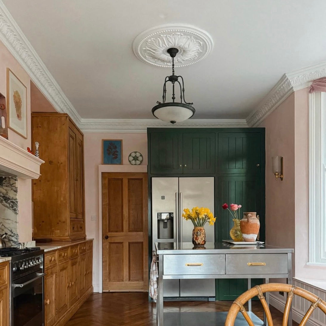 This ornate floral plaster ceiling rose is a classic Victorian design. It has a rich acanthus design carved in high relief, the plain inner ring has a diameter of 160mm. It is one of our more popular Victorian ceiling roses and is seen here with a large Victorian Swan neck coving LPC017,